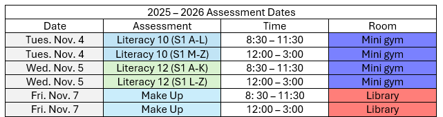 The Literacy Assessment is a provincial assessment that assesses student proficiency in literacy. It is a graduation requirement, and students take the assessments in their Grade 10 and 12 years.